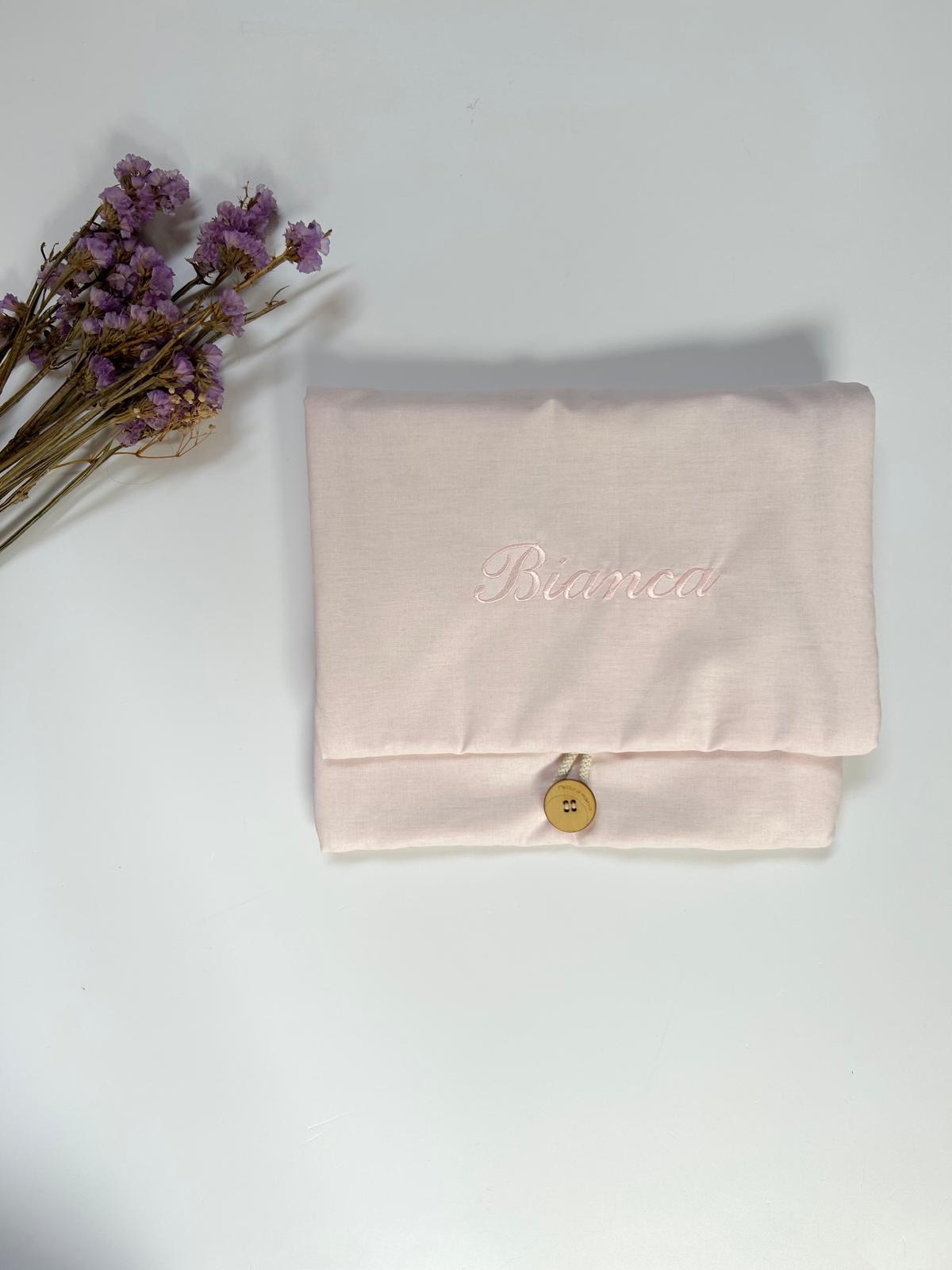 Astuccio porta pannolini realizzato in 100% cotone e cucito a mano. Personalizzabile con nome o iniziali.