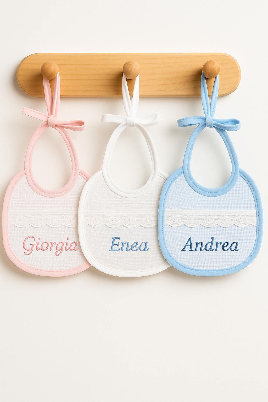 Bavette per bebè con dettaglio in sangallo. Disponibili in 3 varianti: off white, con bordo rosa o con bordo azzurro.