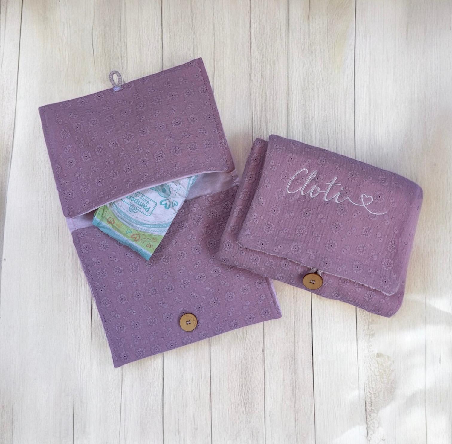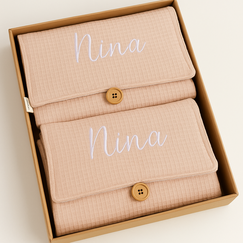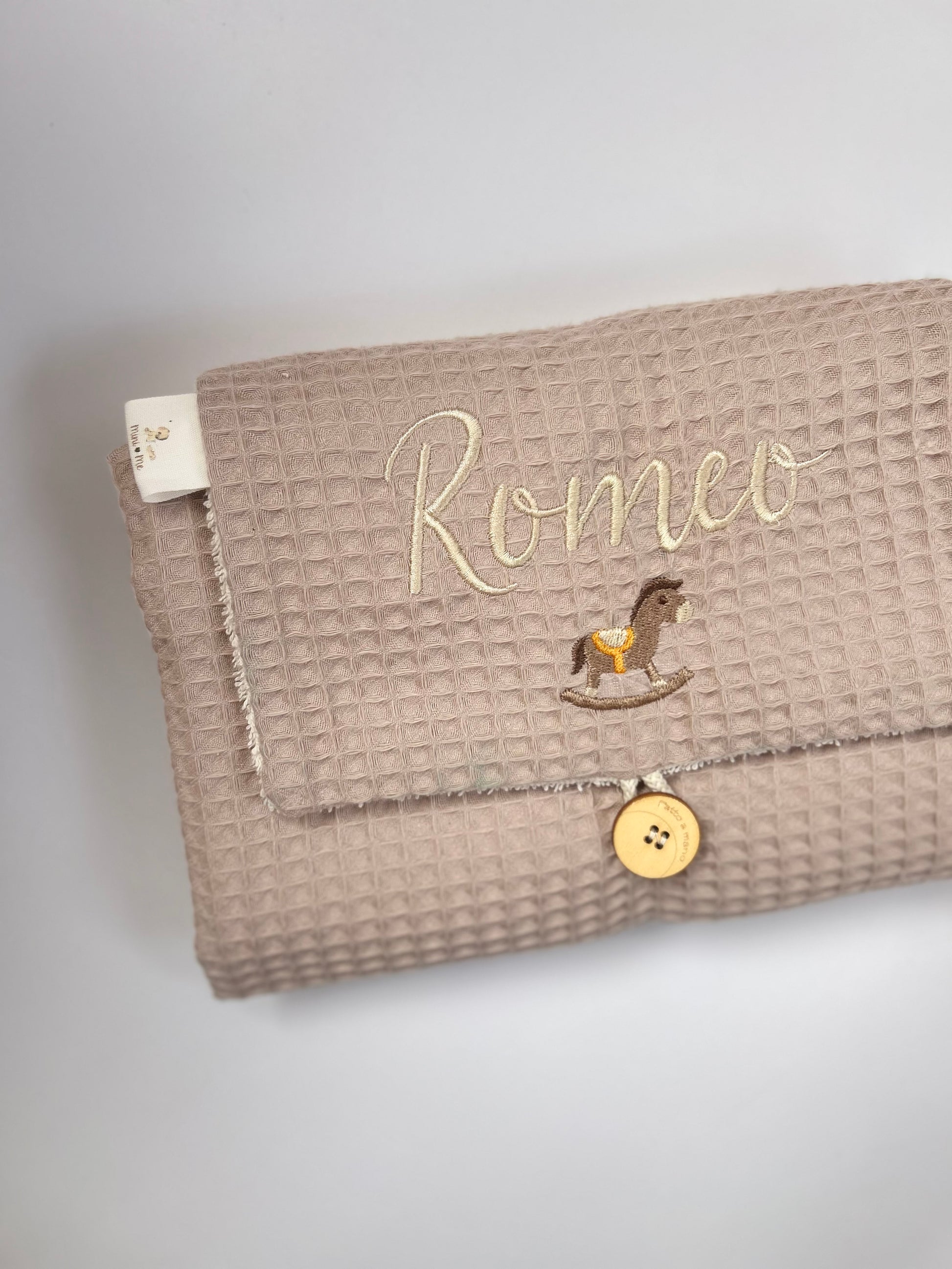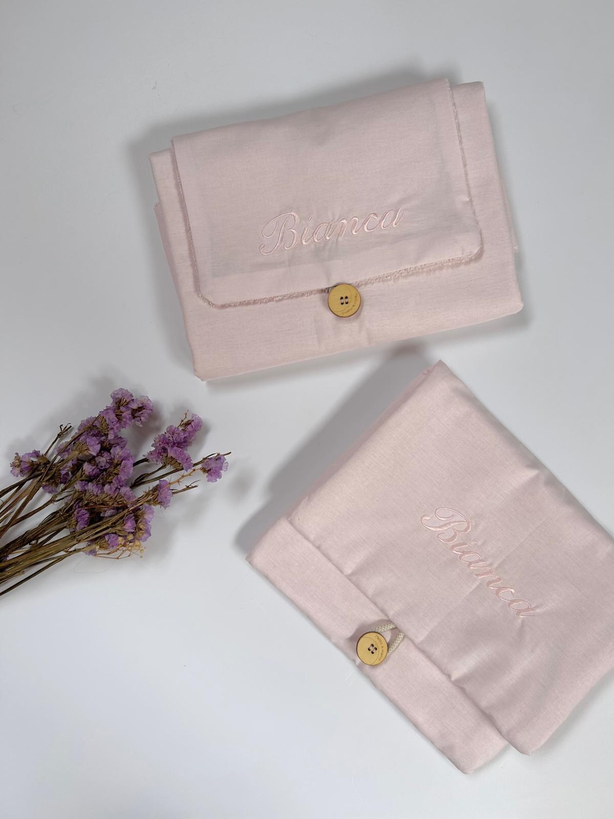 Questa box è perfetta per creare il tuo set per la cura del bebè da viaggio. È composta da un fasciatoio portatile da viaggio e da una pratica bag porta pannolini. Entrambe realizzate interamente a mano e personalizzabili con nome.