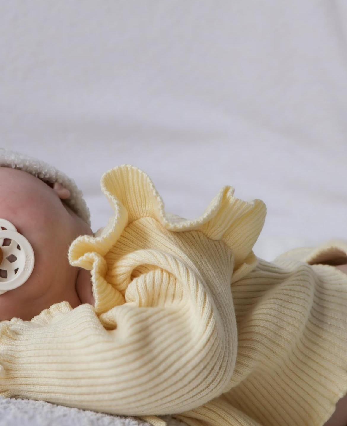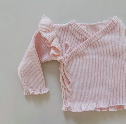 - un top a manica lunga con chiusura stile kimono, lavorazione a costine e dettaglio volant sulle spalle