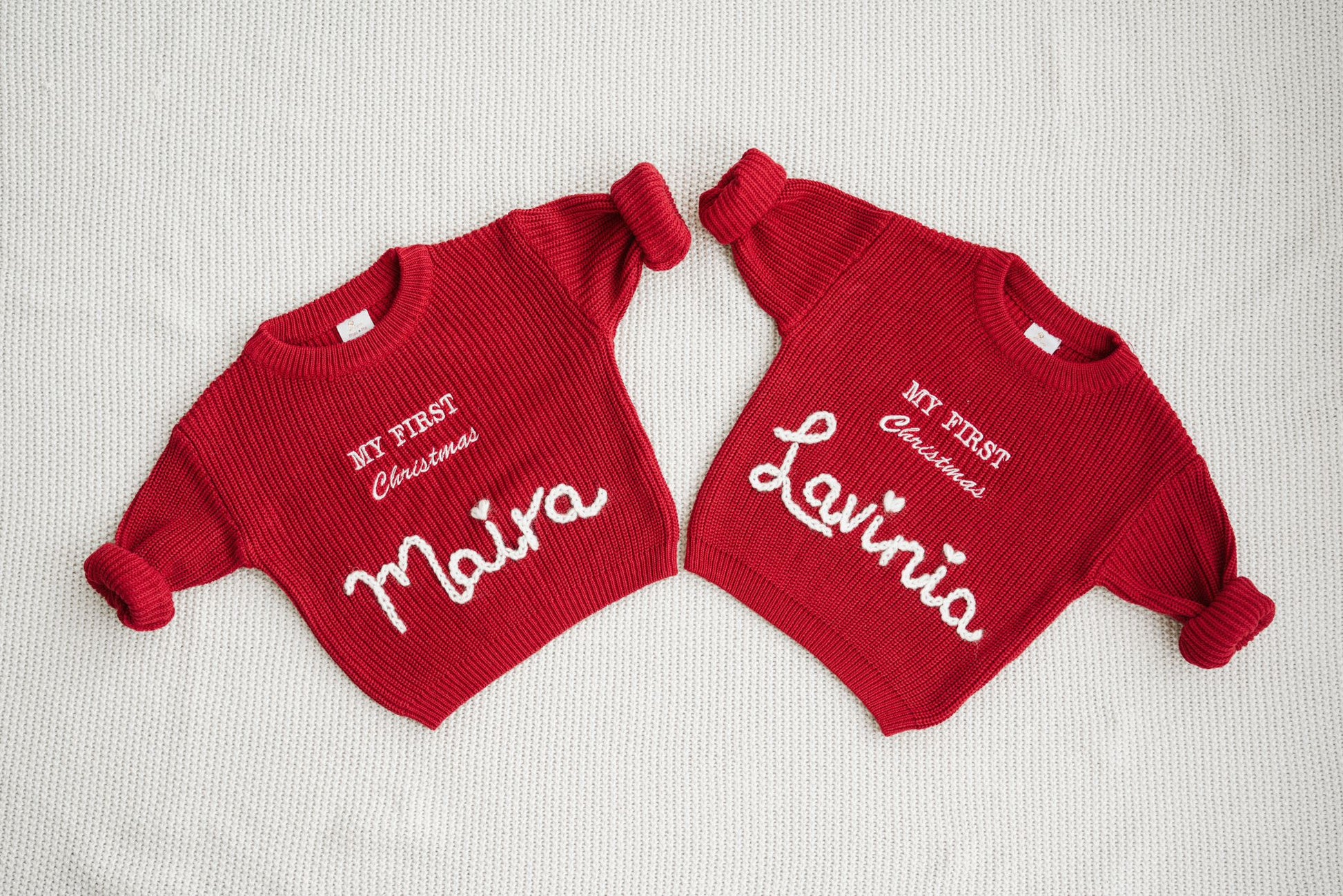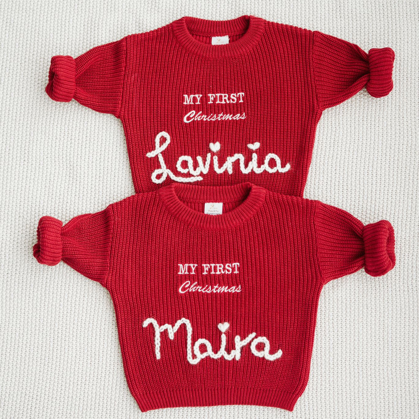 Il primo Natale non si scorda mai. Rendilo indimenticabile con il nostro iconico maglioncino rosso ricamato. Personalizzabile con nome ricamato a mano in filato bianco di alta qualità.