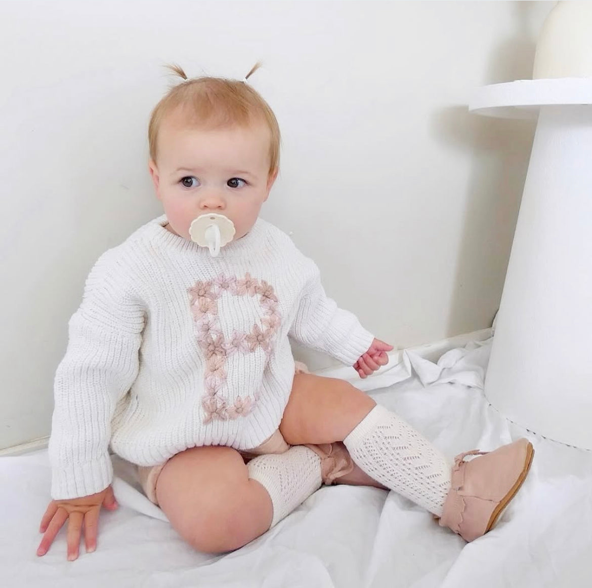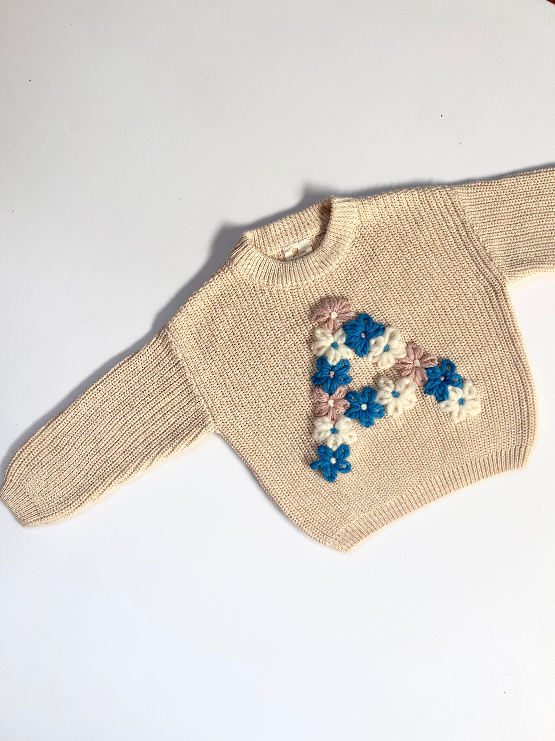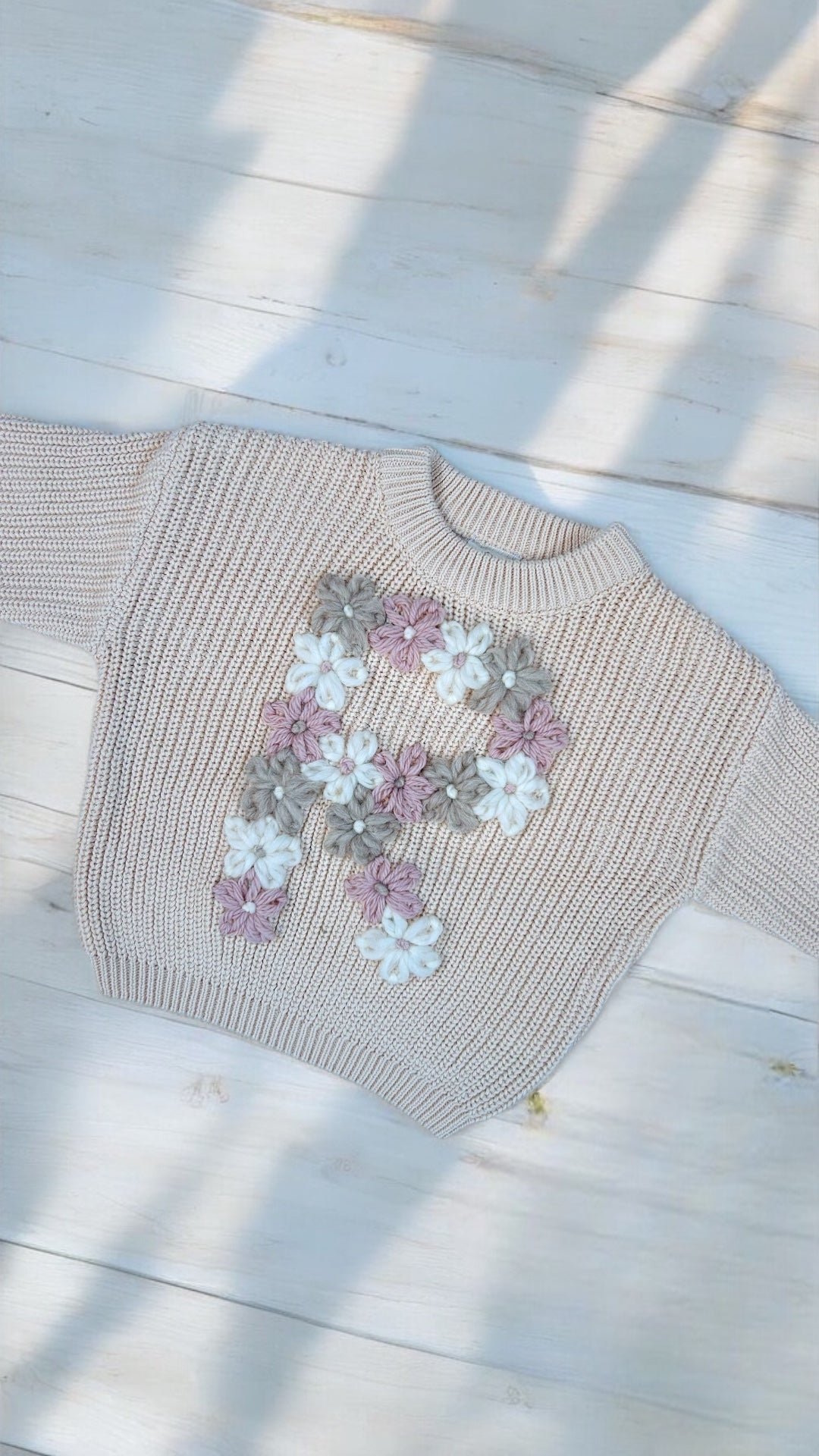Il nostro caldo e morbido maglioncino in cotone, questa volta personalizzato con una grande iniziale ricamata a mano con una splendida lavorazione a fiorellini.