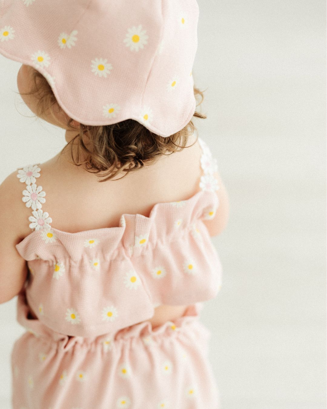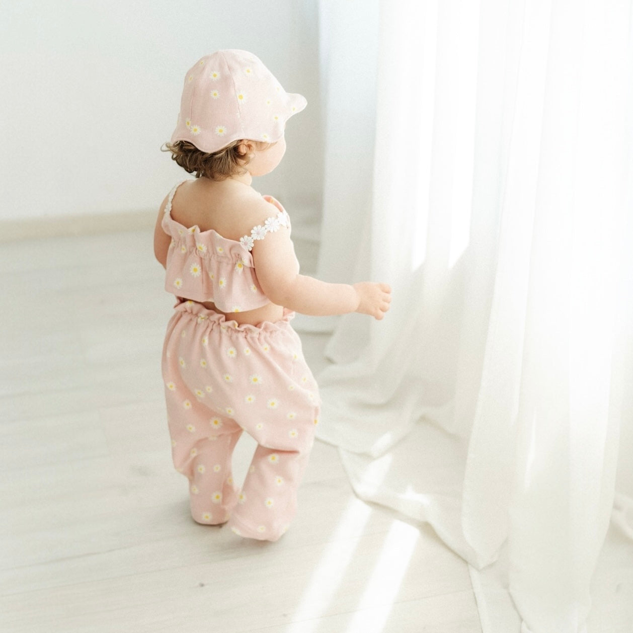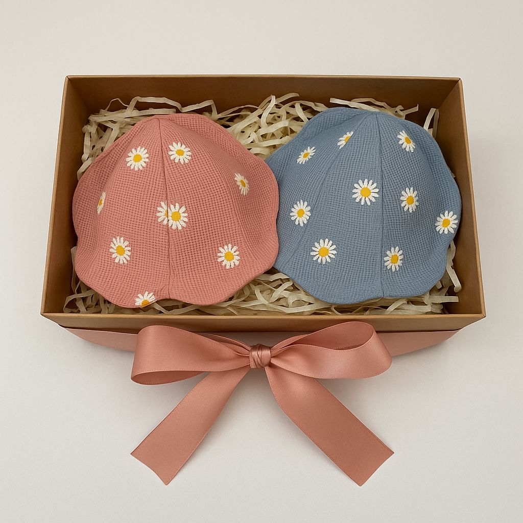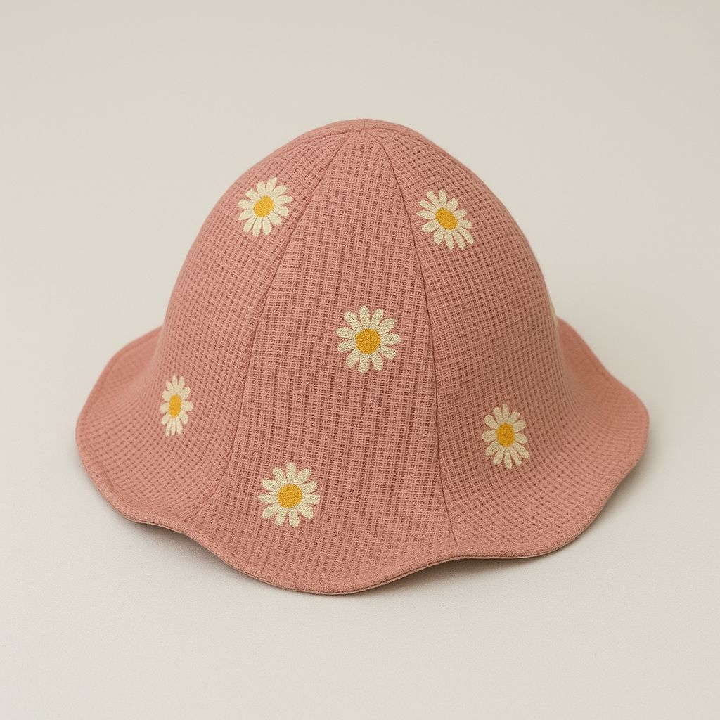 Bellissimo e romantico cappellino da sole in jersey di cotone foderato all'interno e double face cucito a mano e rifinito con orlo a fiore.