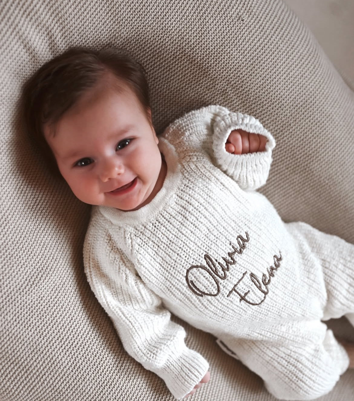 Tutina in morbido e caldo cotone bianco lavorato a costine. Polsini e orlo alla caviglia sono elasticizzati. Chiusura a bottoncini per facilitare il cambio pannolino.