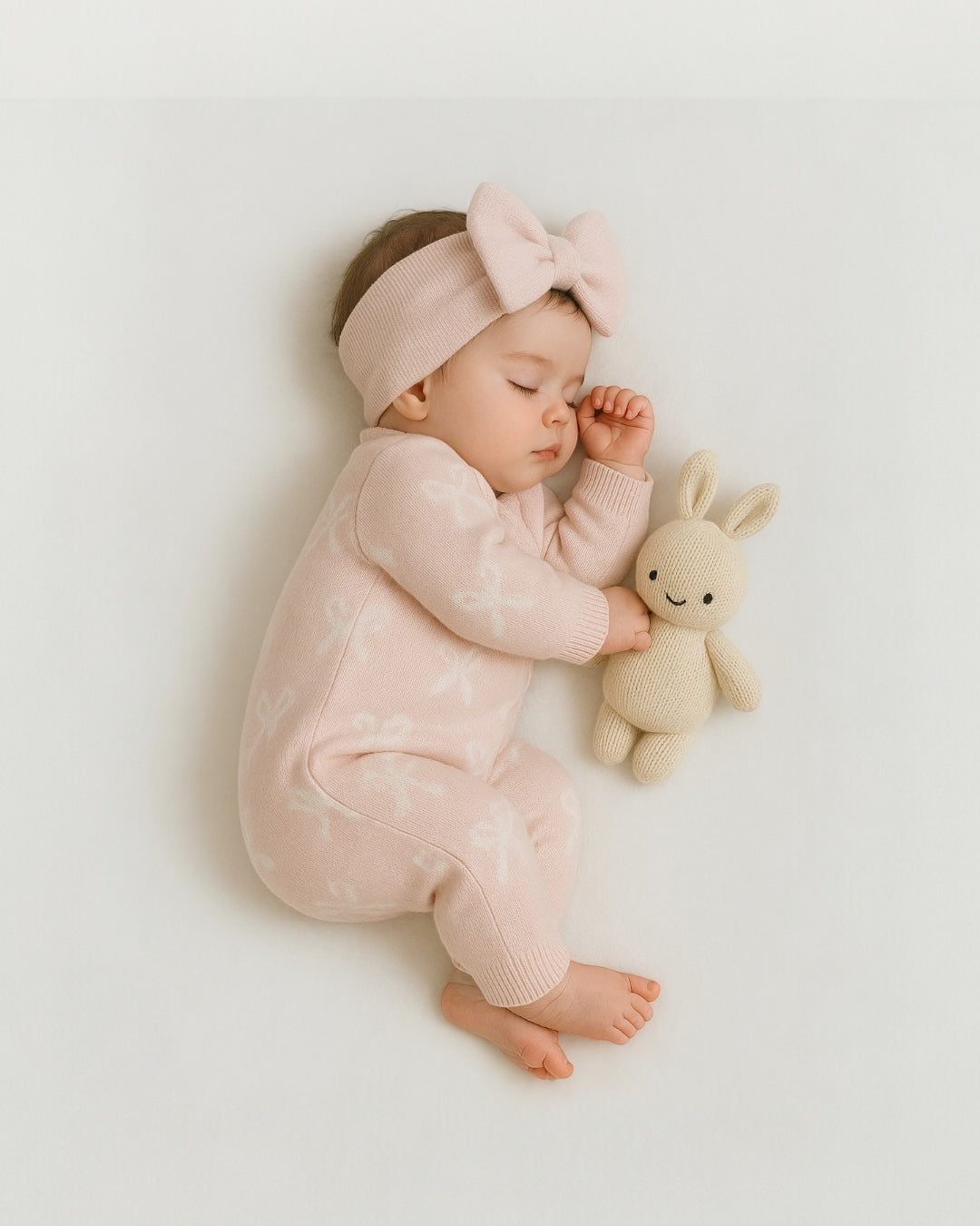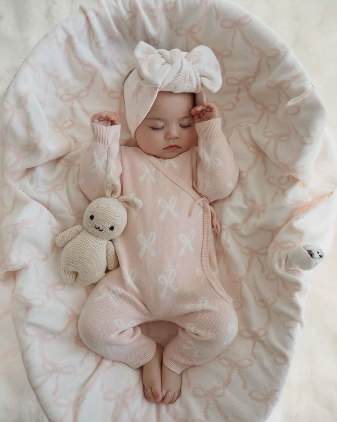 Il modello con apertura incrociata la rende pratica e confortevole, perfetta sia per i primi giorni di vita che come completino speciale per le uscite. Il motivo a fiocchetti aggiunge un tocco romantico e senza tempo, rendendola anche un’idea regalo preziosa.